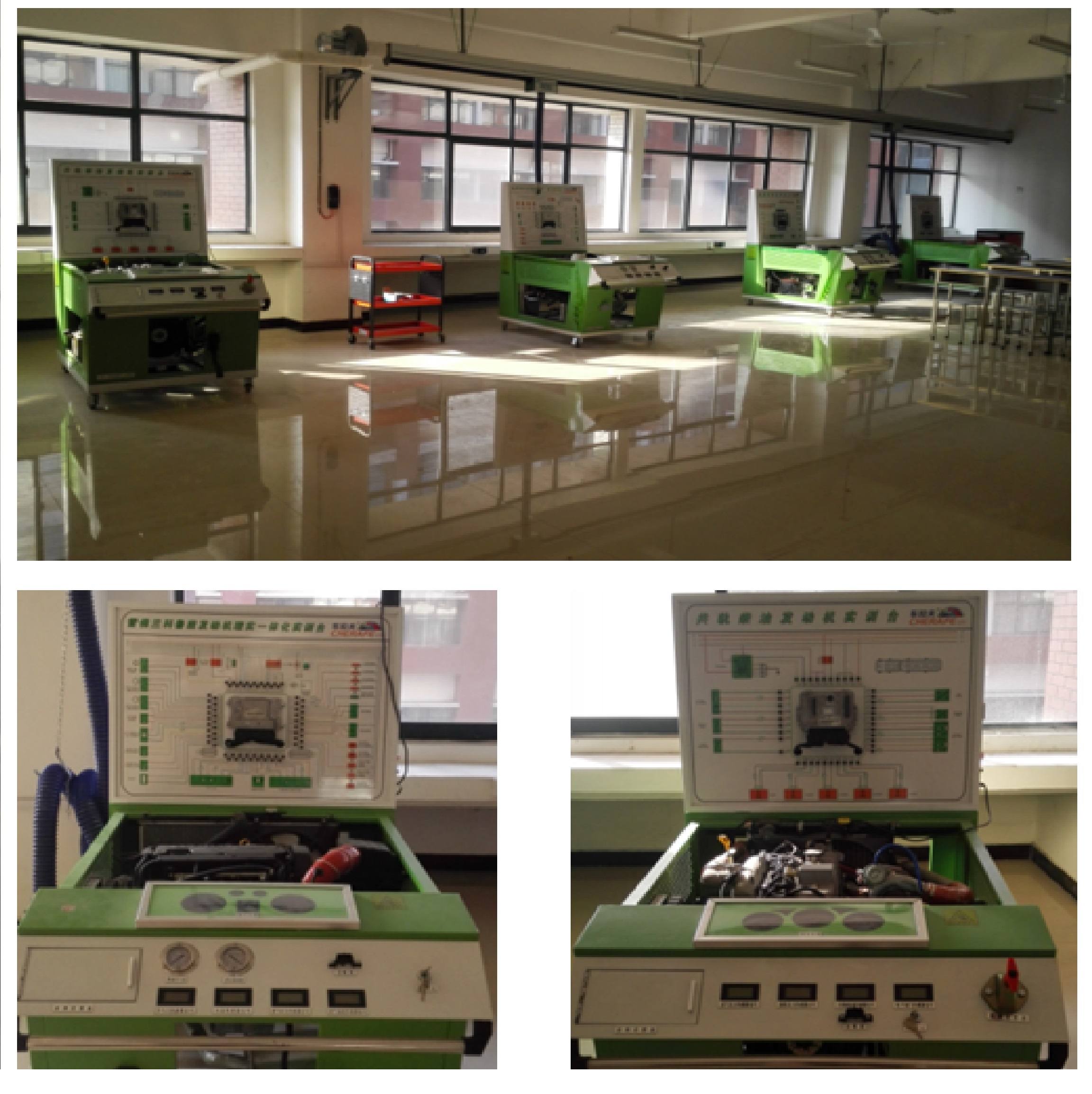 该实训室设备以电喷专用汽、柴油发动机为主,配备先进故障诊断解码仪、发动机台架、综合检测仪、实训台等设备和配套维修工具,承担《汽车发动机电控设备检测与维修技术》课程的项目教学以及汽车发动机技术方面的职业技能鉴定与培训工作,提高学生独立解决发动机故障检测问题的能力。主要设备有雪佛兰科鲁兹发动机理实一体化实训台、共轨柴油发动机实训台、帕萨特B5发动机理实一体化实训台、大众TSI直喷发动机理实一体化实训台。能进行的主要实训项目为电控发动机的整体认识、电控发动机各传感器执行器的检测、发动机的动力性检测、发动机点火系的参数检测、发动机冷却系和润滑系的检测、电控发动机的故障诊断。