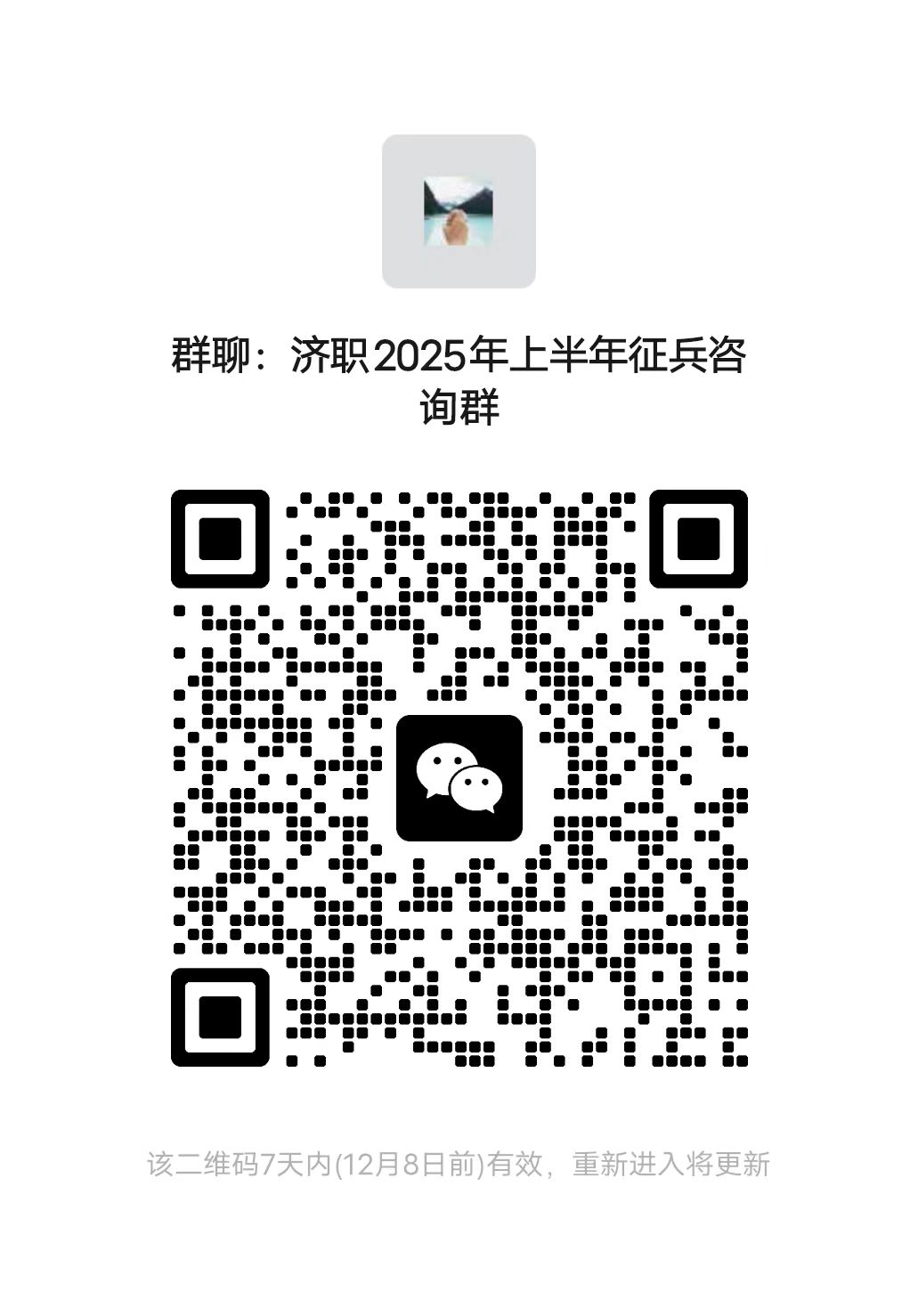 4.微信群咨询:所有报名学生扫码主动加入学校武装部“济职2025年上半年征兵咨询群”,根据群内通知做好相关资料递交工作,同时对征兵有关事项进行咨询。