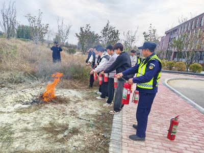 第二个环节,保卫处工作人员现场演示了干粉灭火器“提、拔、握、压”的正确使用方法,新生们踊跃参与,分批进行了灭火实操,亲身体验了扑救初起火灾的过程。