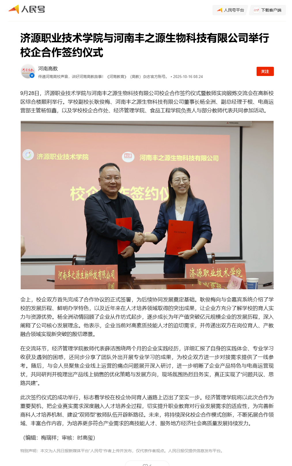 转自2025年10月16日 人民日报:188bet备用网址登录 与河南丰之源生物科技有限公司举行校企合作签约仪式