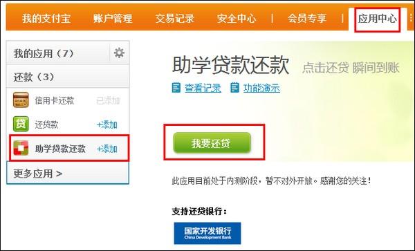 1、登录支付宝账户——【应用中心】——【还款】——【助学贷款还款】;