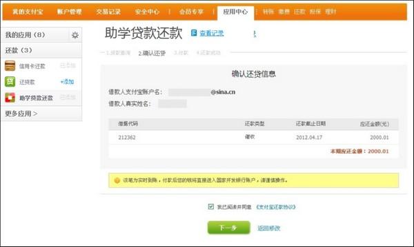 注:任何人登录自己的支付宝账户,都可以在这里输入借款人的上述信息进行贷款信息的查询及还款)